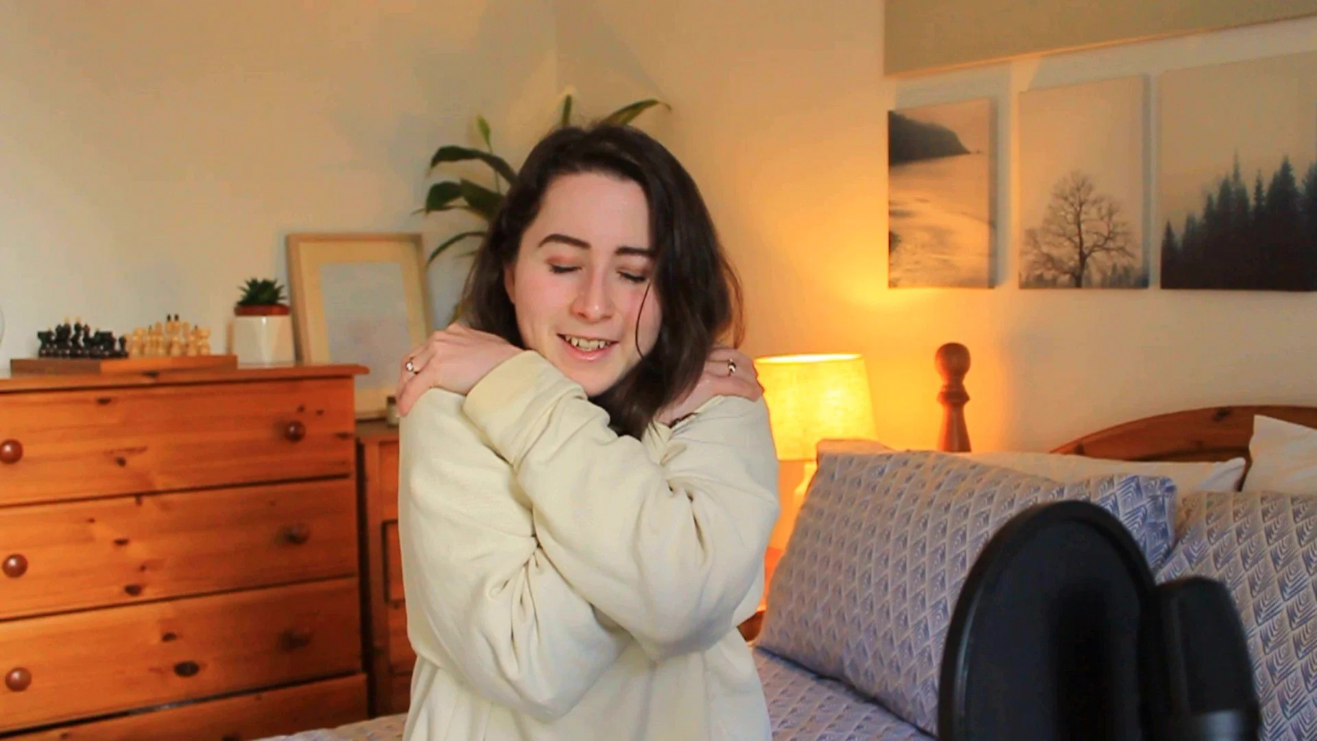First, place your right hand on your left shoulder. Then, place your left hand on your right shoulder. Now give yourself a squeeze -